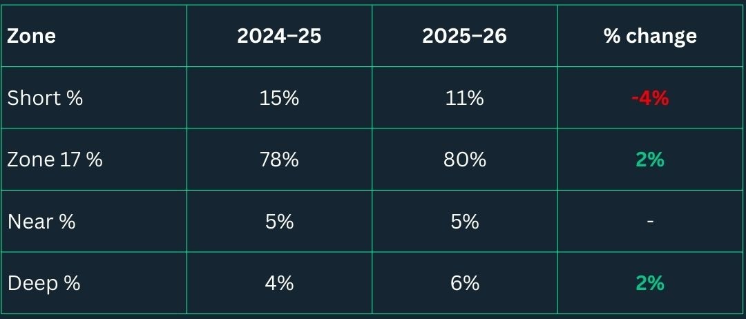 - More deliveries into centre: Teams are using corners more actively to generate shots, with deliveries to Zone 17 up over 2%
